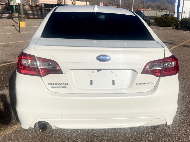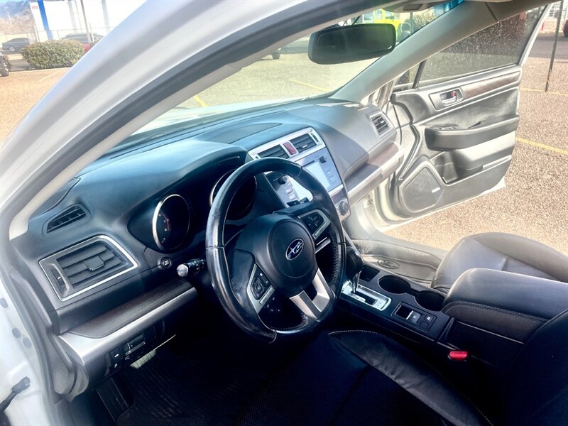 2016 Subaru Legacy 2.5i Limited — Crystal White Pearl exterior with Slate Black leather-trimmed interior. Powered by a 2.5L H4 engine producing 175 hp and 174 ft-lbs of torque, this Legacy pairs efficient performance with Subaru’s Symmetrical All-Wheel Drive and a Lineartronic CVT for smooth, confident operation. Fuel economy is excellent for the class at an EPA-rated 26 MPG city and 36 MPG highway. This example shows good mileage—below 107,000 miles—averaging under 10,000 miles per year.